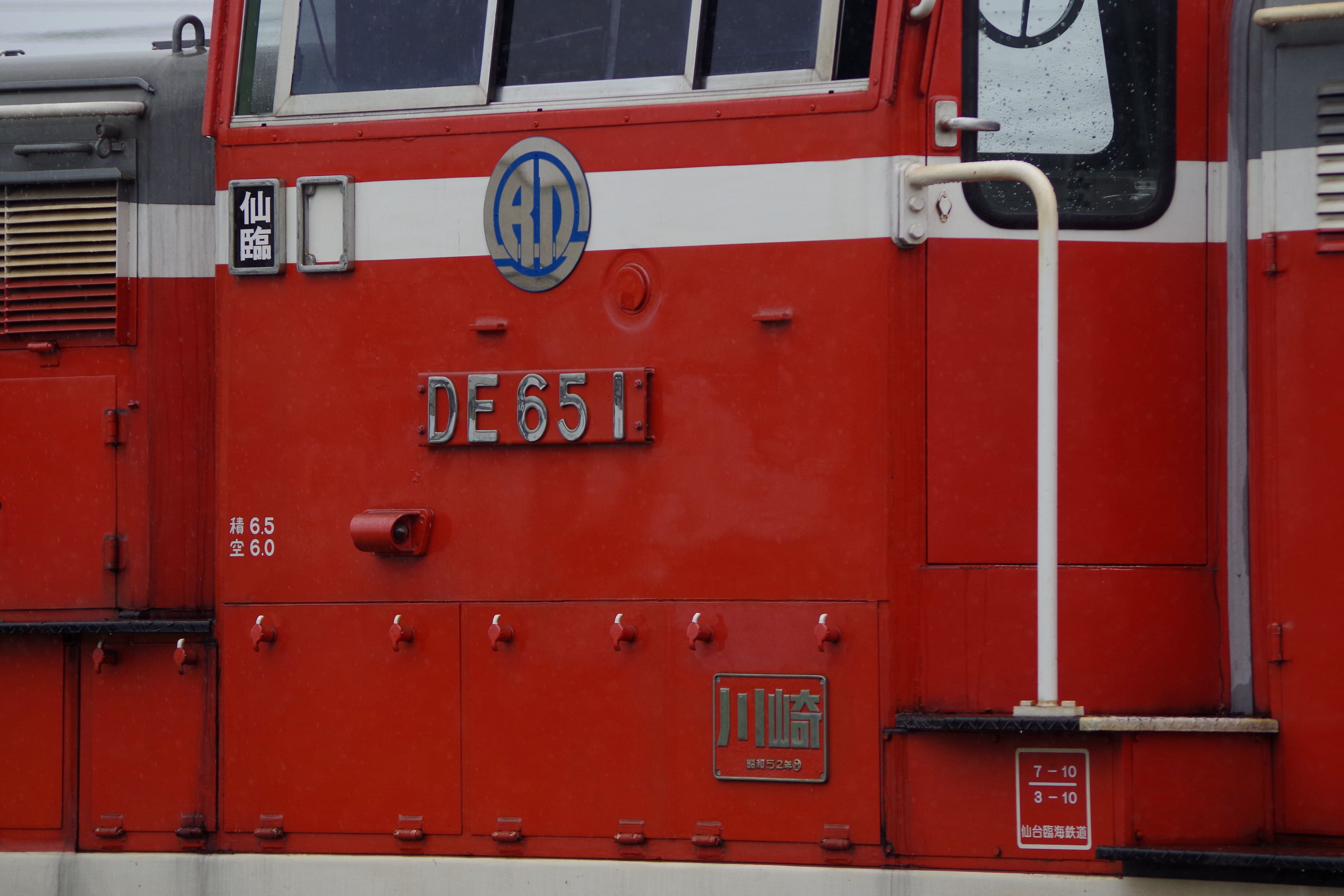 DE65 1的駕駛室窗戶下方的是仙台臨海鉄道的社徽,下面的是車號,左邊區名札寫著仙台臨海鉄道的簡稱「仙臨」,右下角的是製造商川崎的銘版,最右邊的則是檢查標記,可以看到上次檢查是令和三年(2021年)十月,下次檢查則是令和七年(2025年)十月