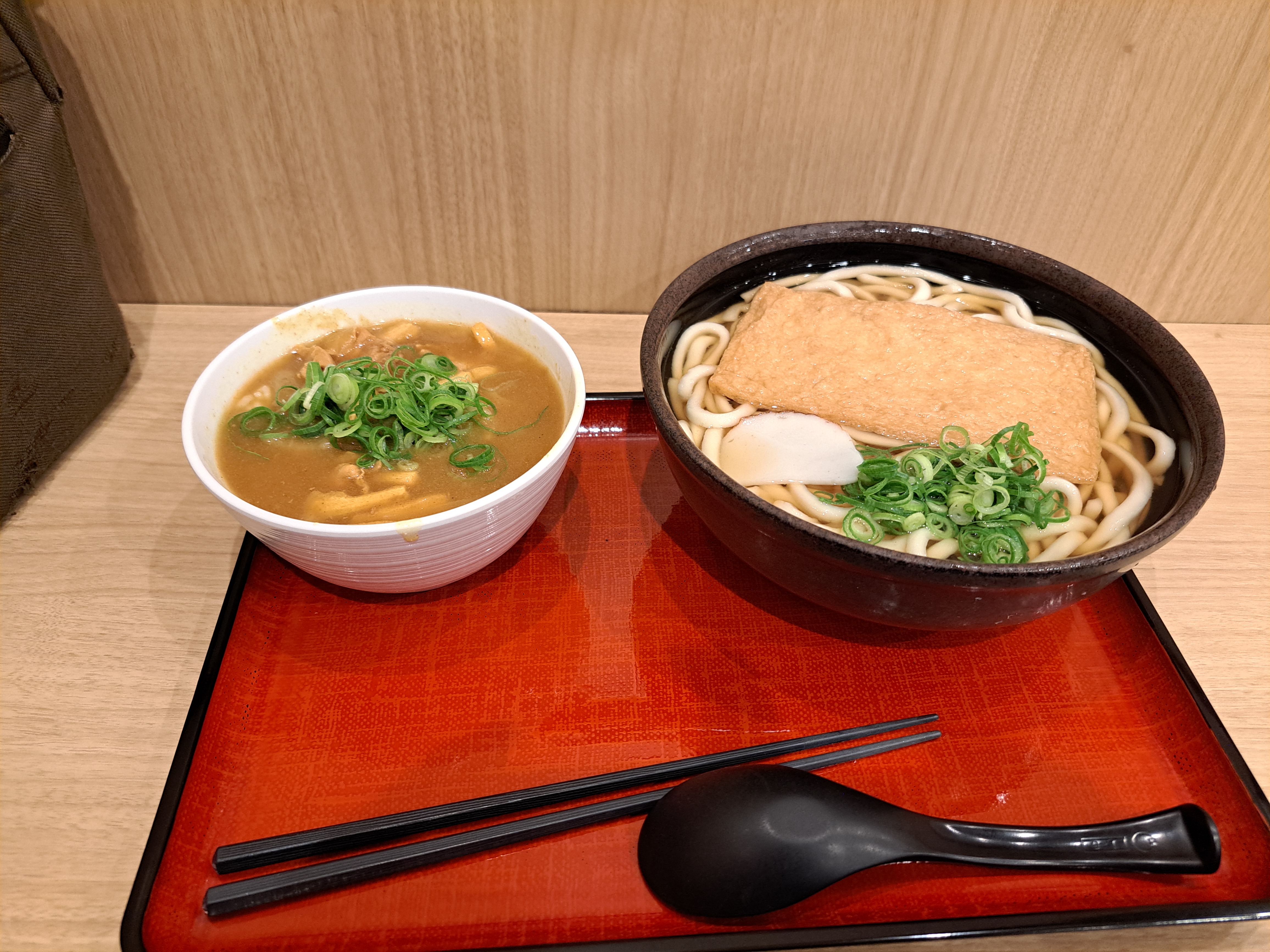 筆者點了一份大盛的豆皮烏龍麵跟咖喱飯,Q彈的烏龍麵配上帶著點甜味的豆皮是最經典不過的組合,而咖喱飯香氣十足,裡面加了點豆皮,不過咖哩有點像湯的感覺。在用餐的同時,店裡正播放著NMB48的歌曲,而樓下來來去去的西日本電車,都在提醒著這裡是西日本的領地,不過這裡就是筆者這整趟旅程的最西端了,用完餐後先搭乘JR西日本的列車回到米原再轉乘JR東海的列車回到岐阜,結束了一整天的旅程